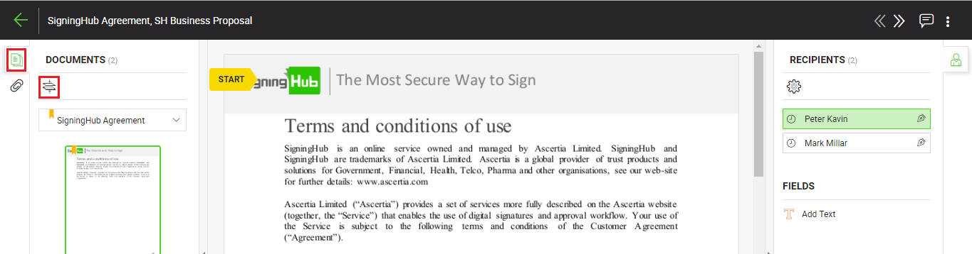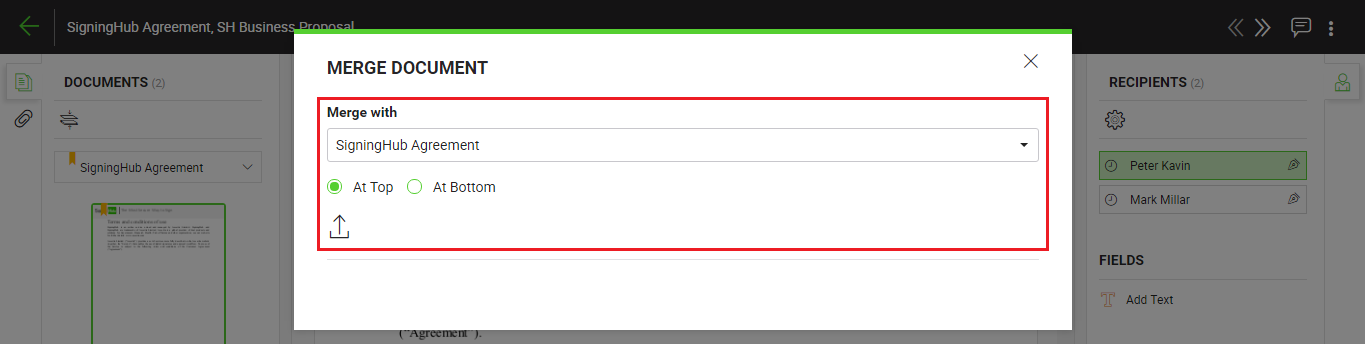 When you receive a document with merging permissions, you can merge other documents with it before signing. The merged documents by you will be fused with the actual document and are automatically signed along with the document signing.