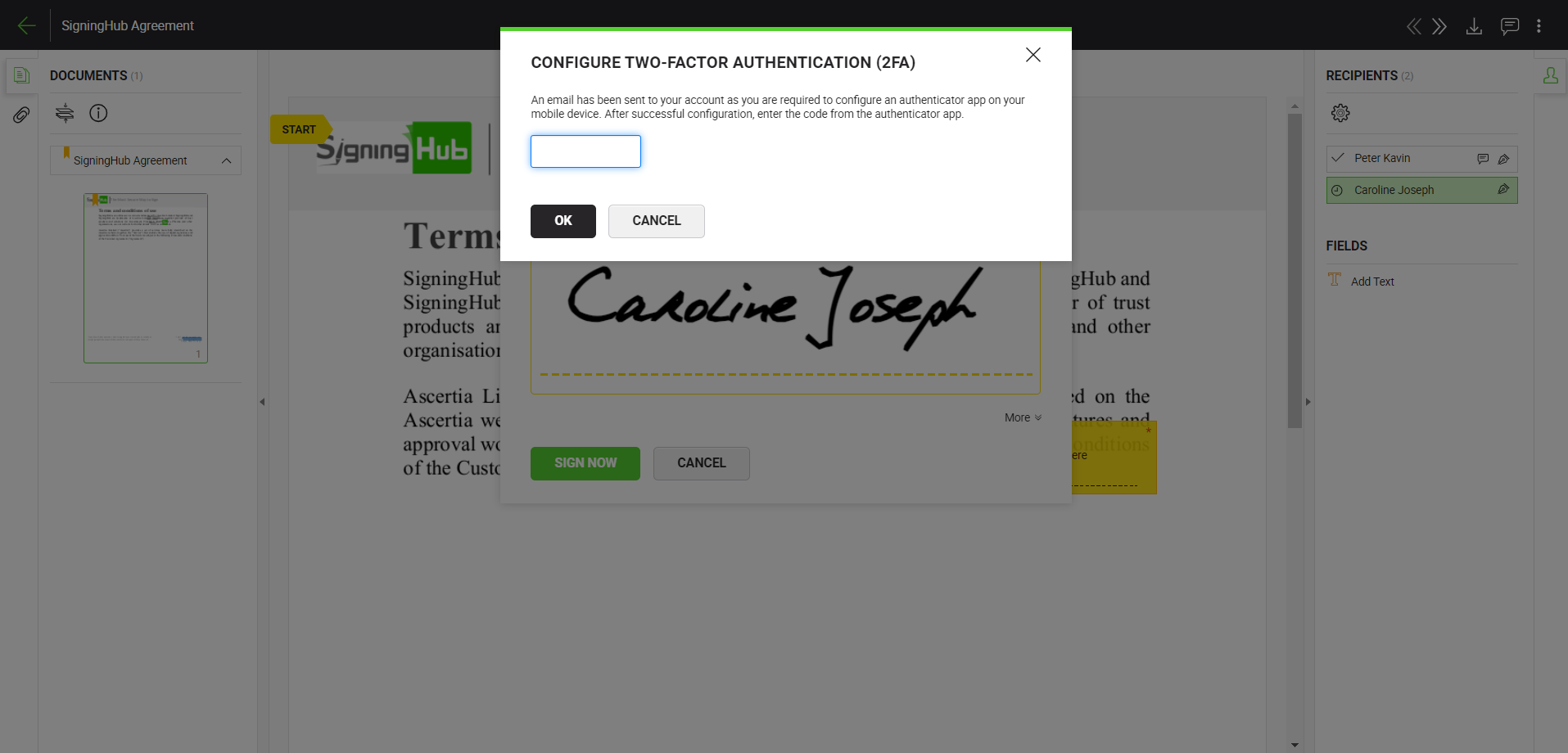 To set up, the user can either scan the "QR Code" or manually input the "Manual Key" in the Authenticator app. Once the registration is successful, the user can provide the automatically generated Time based One Time Password from the Authenticator app to SigningHub in order to proceed. The list of recovery codes included in the configuration email can be used in place of a Time based One Time Password, once each recovery code, to regain access to your SigningHub account, in case you lose access to your mobile device. It is advised to save the recovery codes in a safe place. The user can however, regenerate a new list of the recovery codes from the Manage Two Factor Authentication (2FA) option. In case enterprise user loses access to your mobile device and recovery codes, or have used all of the recovery codes, you can ask your enterprise admin to reset the two factor authentication (2FA) against your account.