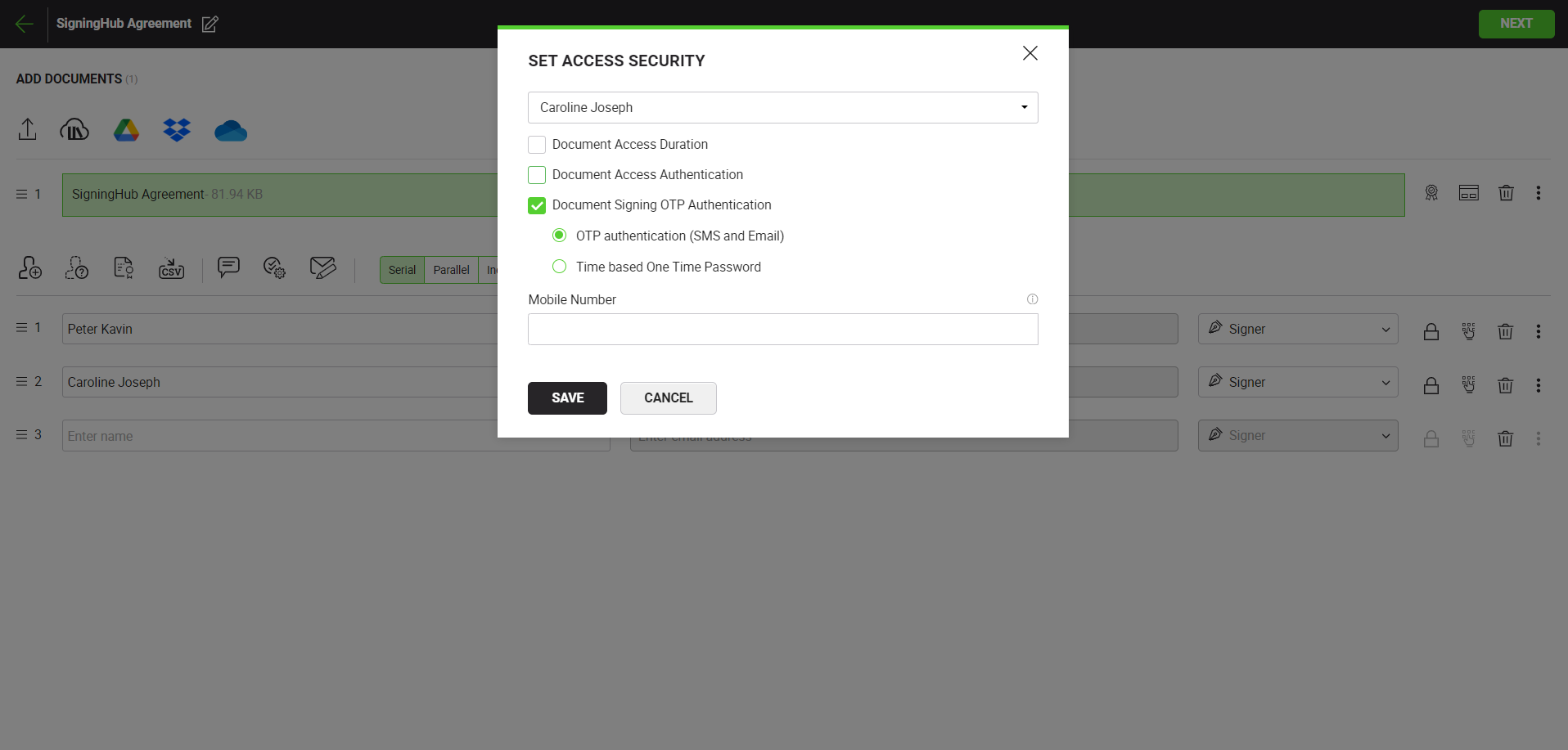 - From the "Set Access Security" dialog, check the "Document Signing OTP Authentication", and from the following options choose either "OTP Authentication" or "Time based One Time Password".