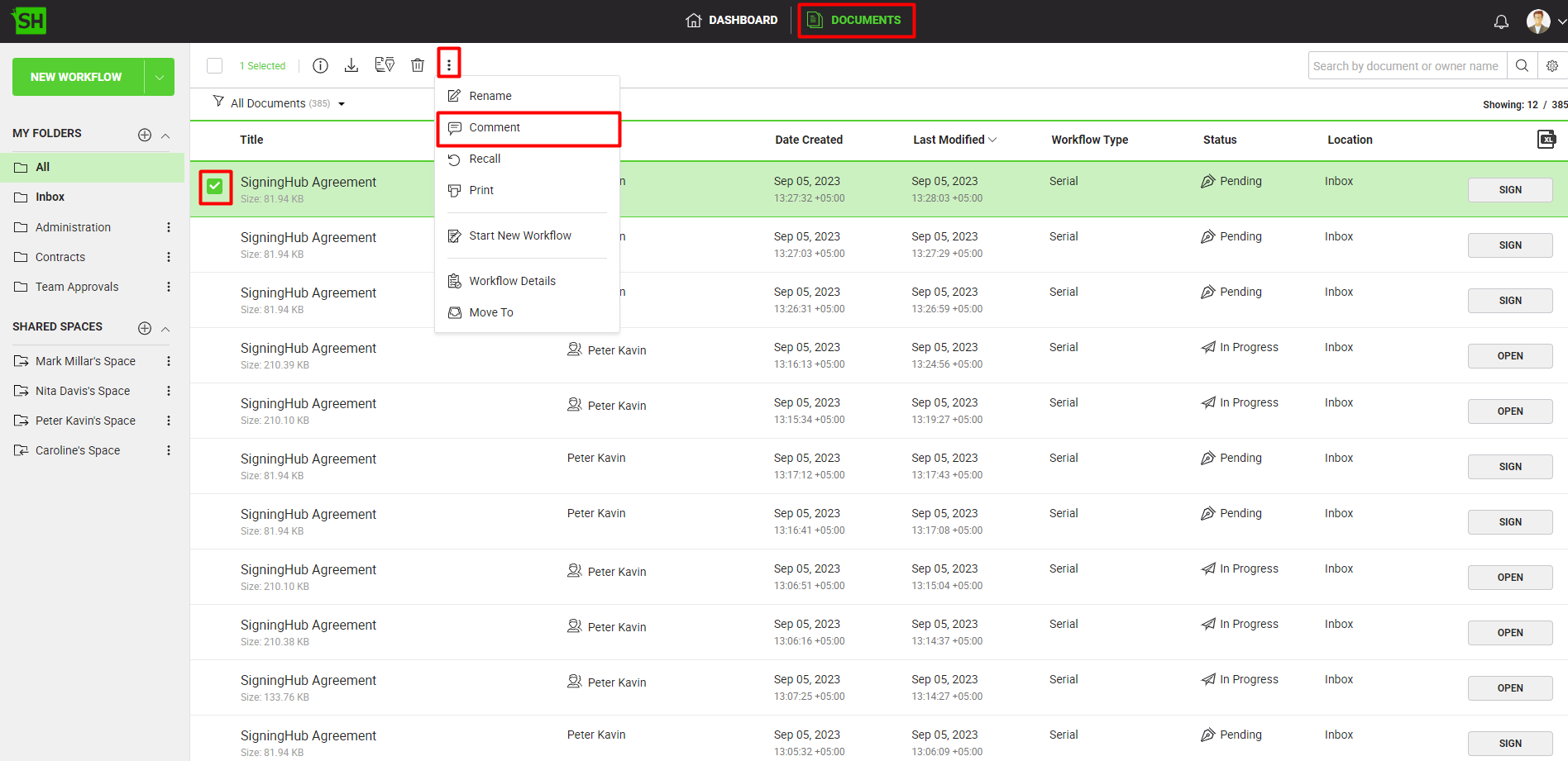 - Click the "Documents" option, available at the top of the SigningHub screen.