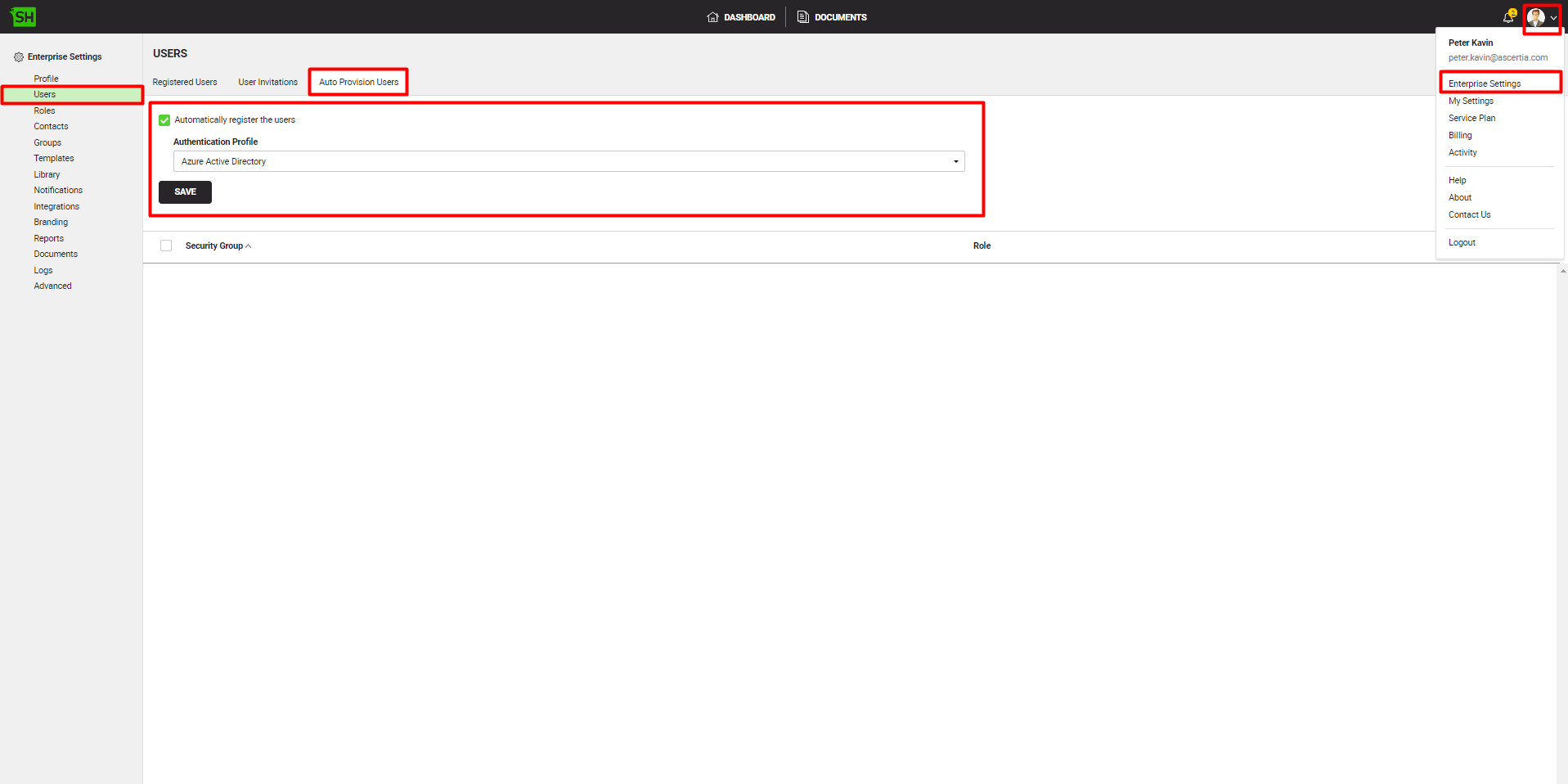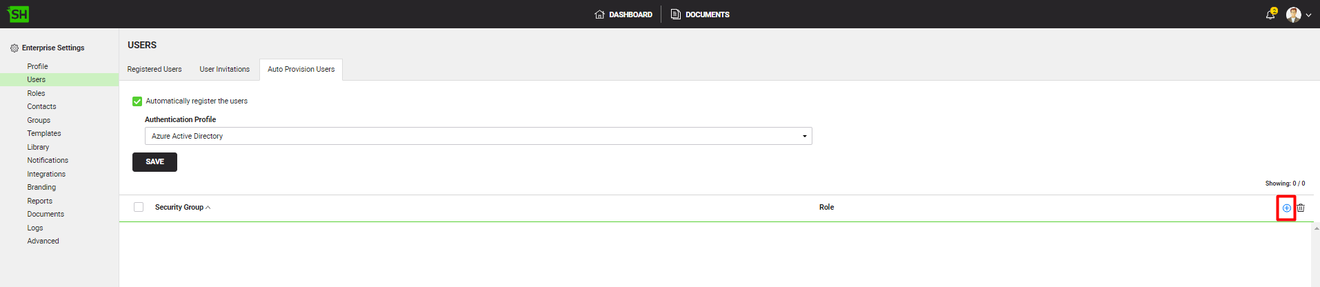 All the users that belong to the selected authentication profile will be authorised through Azure Active Directory upon Login, and will be automatically registered and activated in SigningHub under the default SigningHub role, provided that provisioning is not enabled by any other enterprise within the same on-premises deployment.