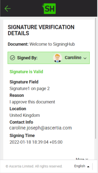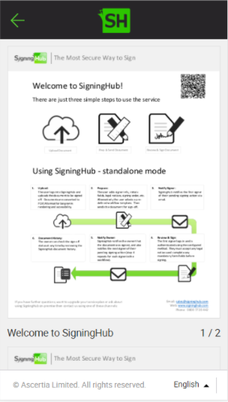 e.g. https://web.signinghub.com/document/0f03133f-d7a4-4c03-a140-eea3e3b47b75 which will display a screen with document name and two options "View Document" , "Verify Signature".