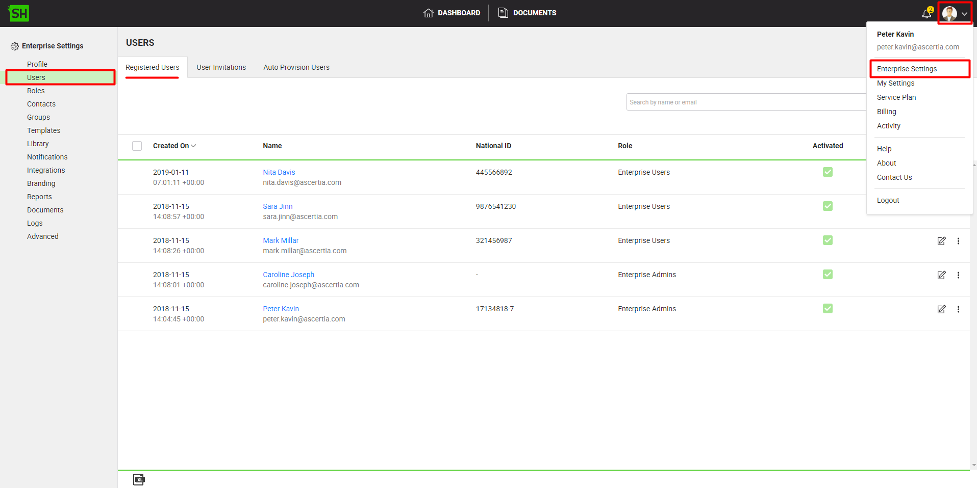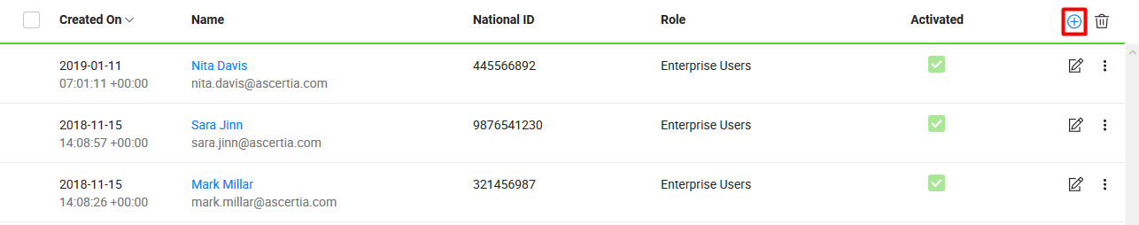 The "User" screen will appear listing all your registered enterprise users.