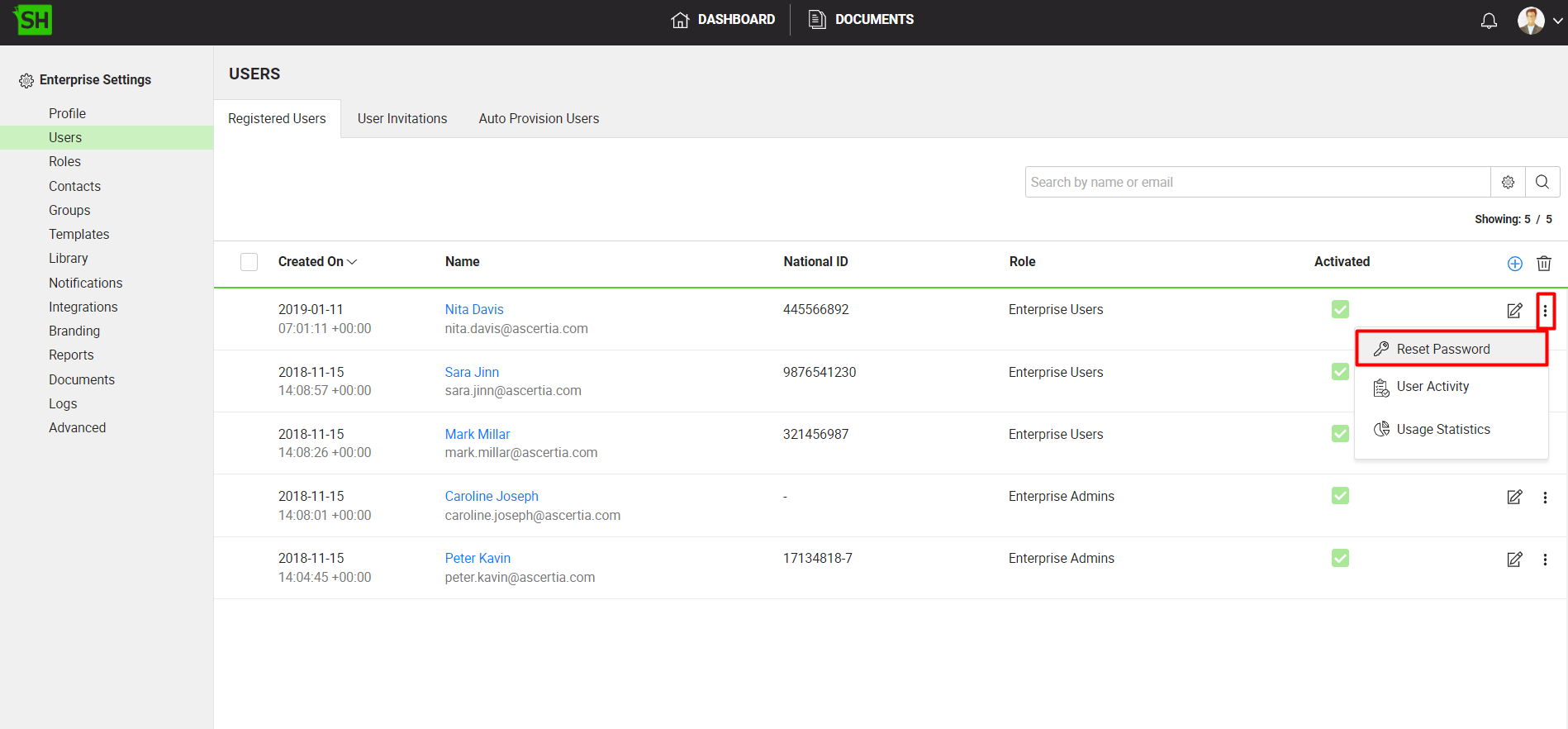 - Click the "Users" option from the left menu. Your existing enterprise users will be listed.