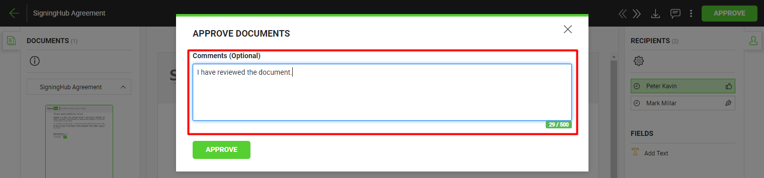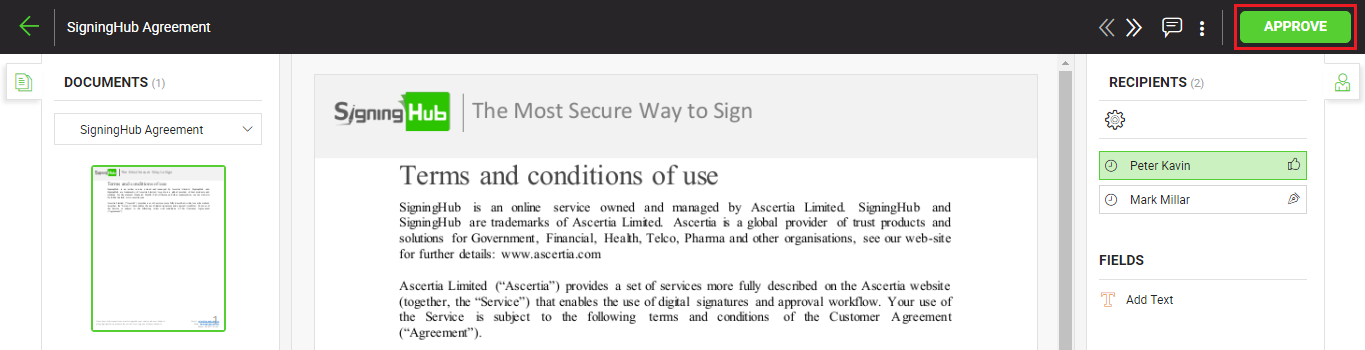 - Click the "Approve" button from the right of document viewer header, and agree to the legal notice (if any configured for you).