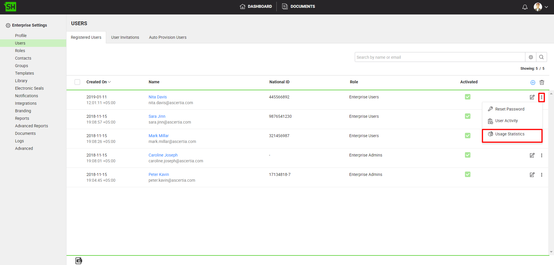 - Click the "Users" option from the left menu. Your existing enterprise users will be listed.