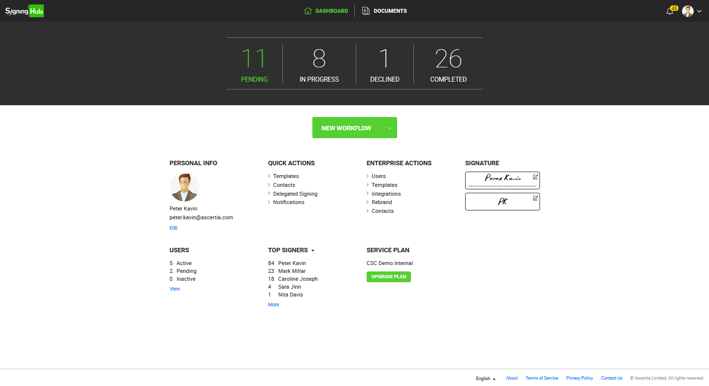 It provides the real-time clickable snapshot of your workflow documents, and provides gateway to other important areas like provision to start a new workflow, edit your personal info, edit your personal settings, edit your enterprise settings, edit your signature, view your enterprise users, view your top 5 signers/ senders/ disk consumers, and view your service plan details.