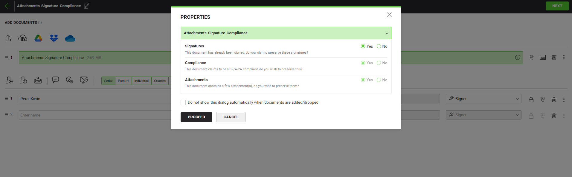 This option will only appear if the uploaded document contains any signatures. By default, the "Yes" option will be selected.