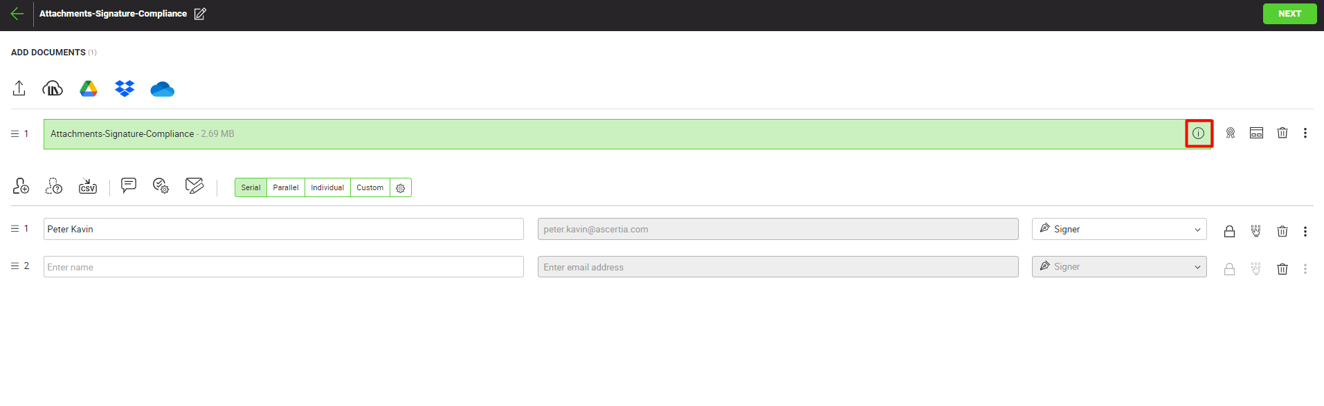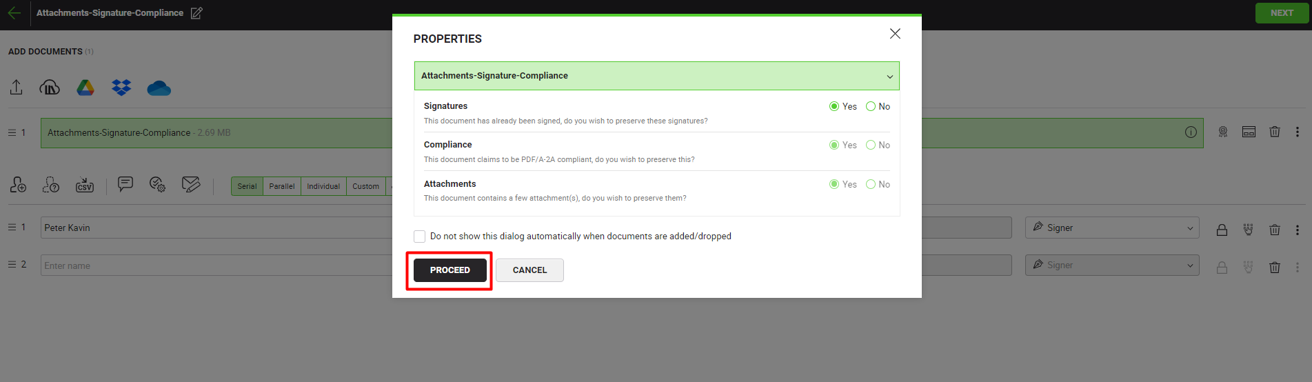 - Upload a document that contains signatures, attachments, and/or is PDF/A compliant.