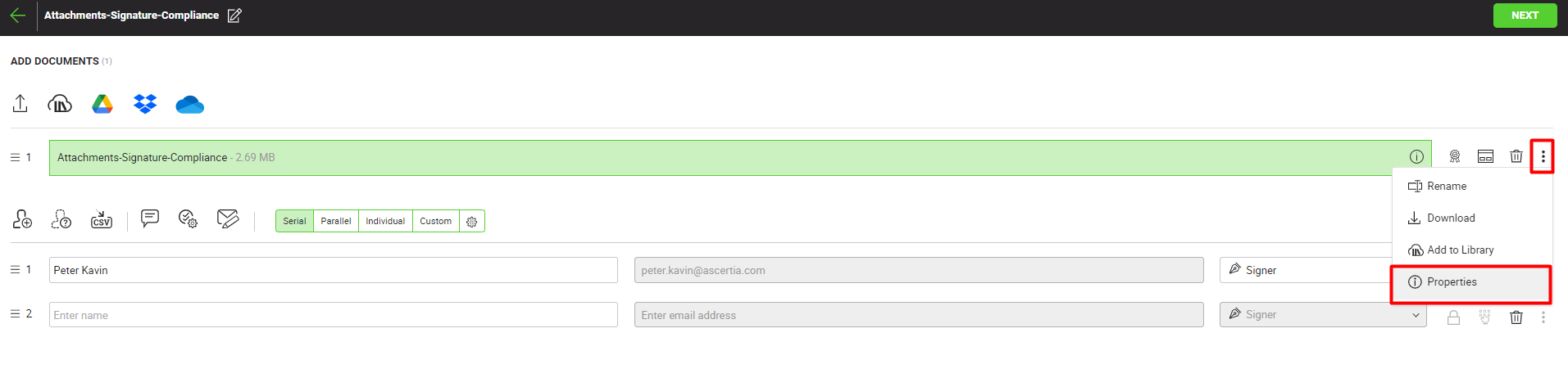 - Once the document is uploaded, the "Properties" dialog will appear. This dialog will display the name of the document and all the properties contained in the document. From the "Properties" dialog, the user can choose which properties they want to preserve in the document.