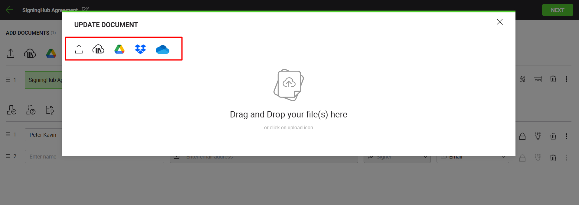 - Upon clicking the re-upload button, the "Update document" dialog will open, allowing the user to add a new document. This will replace the old document with the new document.