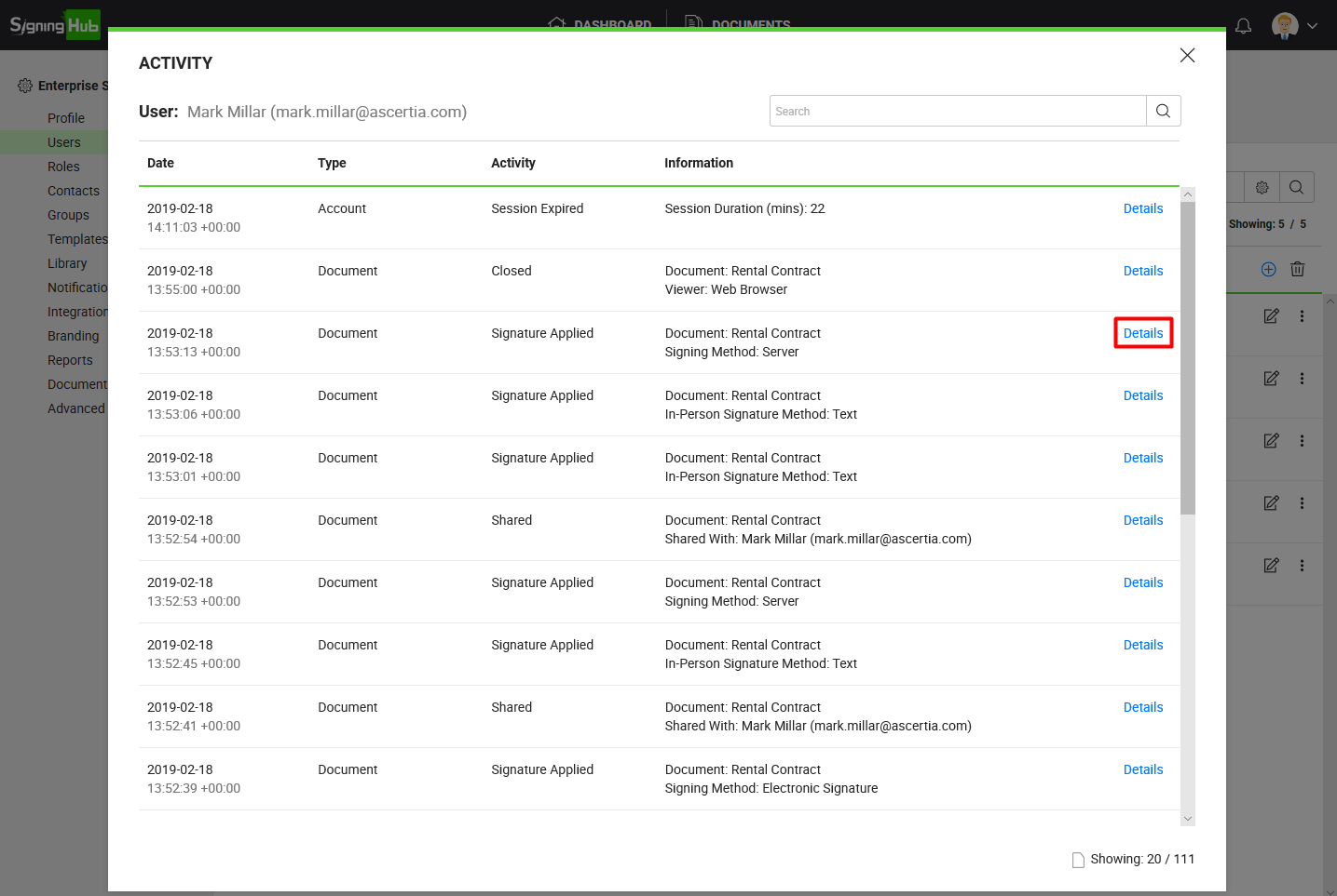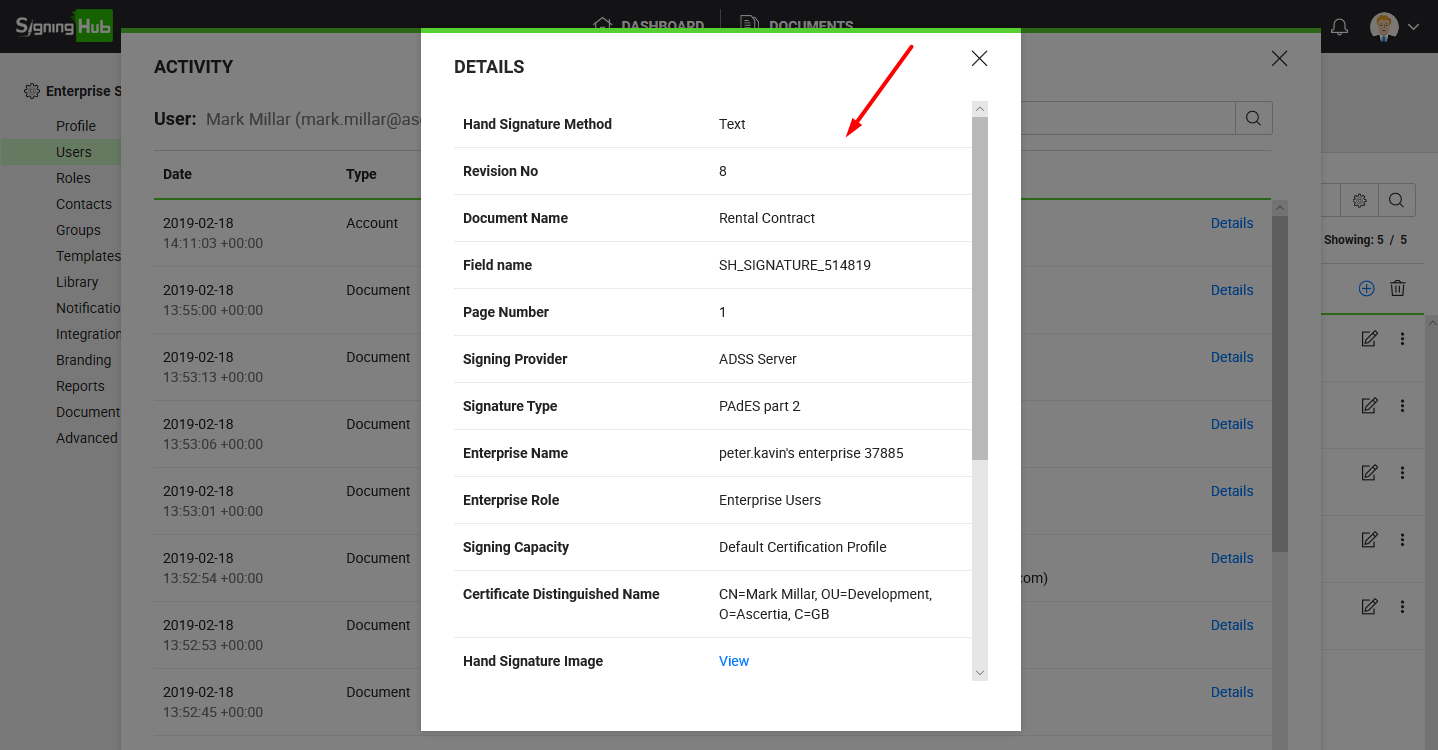 SigningHub records the high-level activities of each user account along with particular date and time stamps, and other details to provide an effective audit trail.