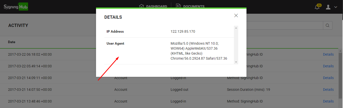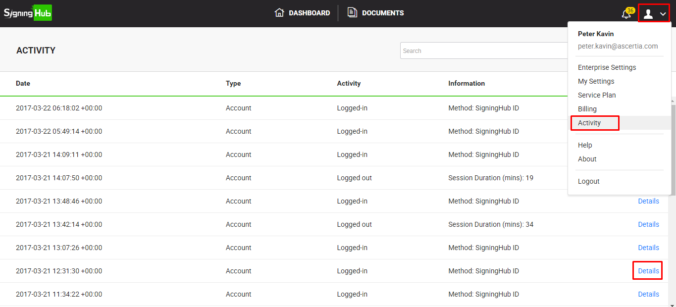 SigningHub records your high-level activities along with particular date and time stamps, and other details to provide an effective audit trail. There are mainly 5 types of activities that are logged, i.e. Account/ User, Document, Billing, Settings and Enterprise related activities. In this regard, the following activities are logged: