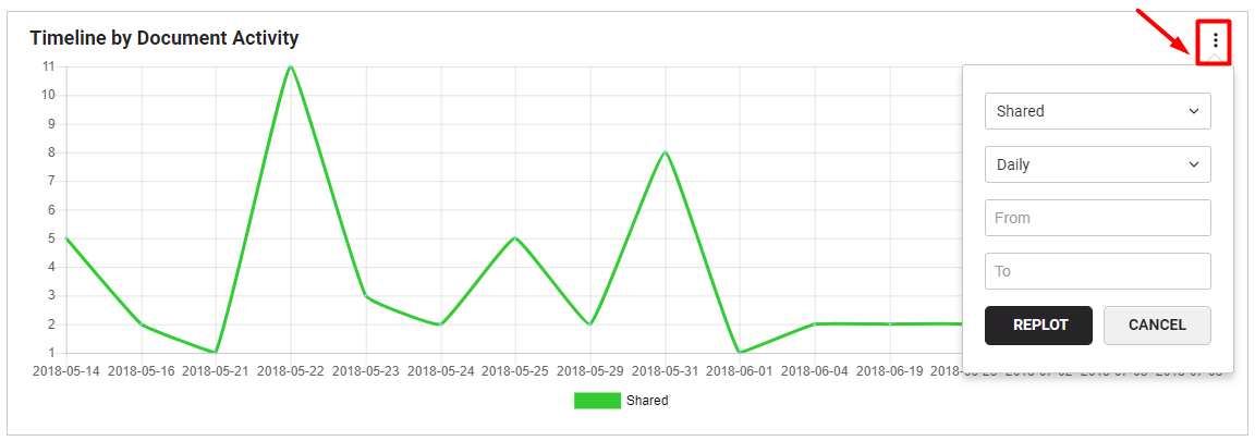 This timeline lets you choose a document activity from the given list, frequency, and the date parameters to view their respective graph, i.e.