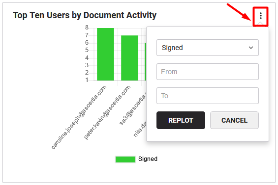 This bar chart lets you choose a document activity from the given list and specify the date parameters to see its top ten performers from your enterprise users, i.e. Top ten users who have: