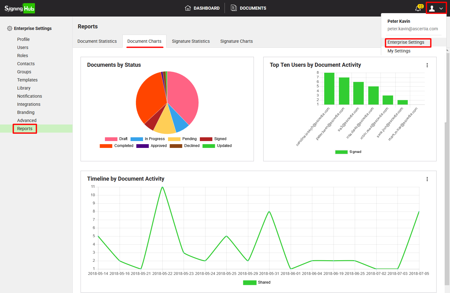 This pie chart delineates the status based counts of documents within your enterprise account, i.e. Draft, In Progress, Pending, Signed, Approved, Updated, Declined, and Completed documents.
