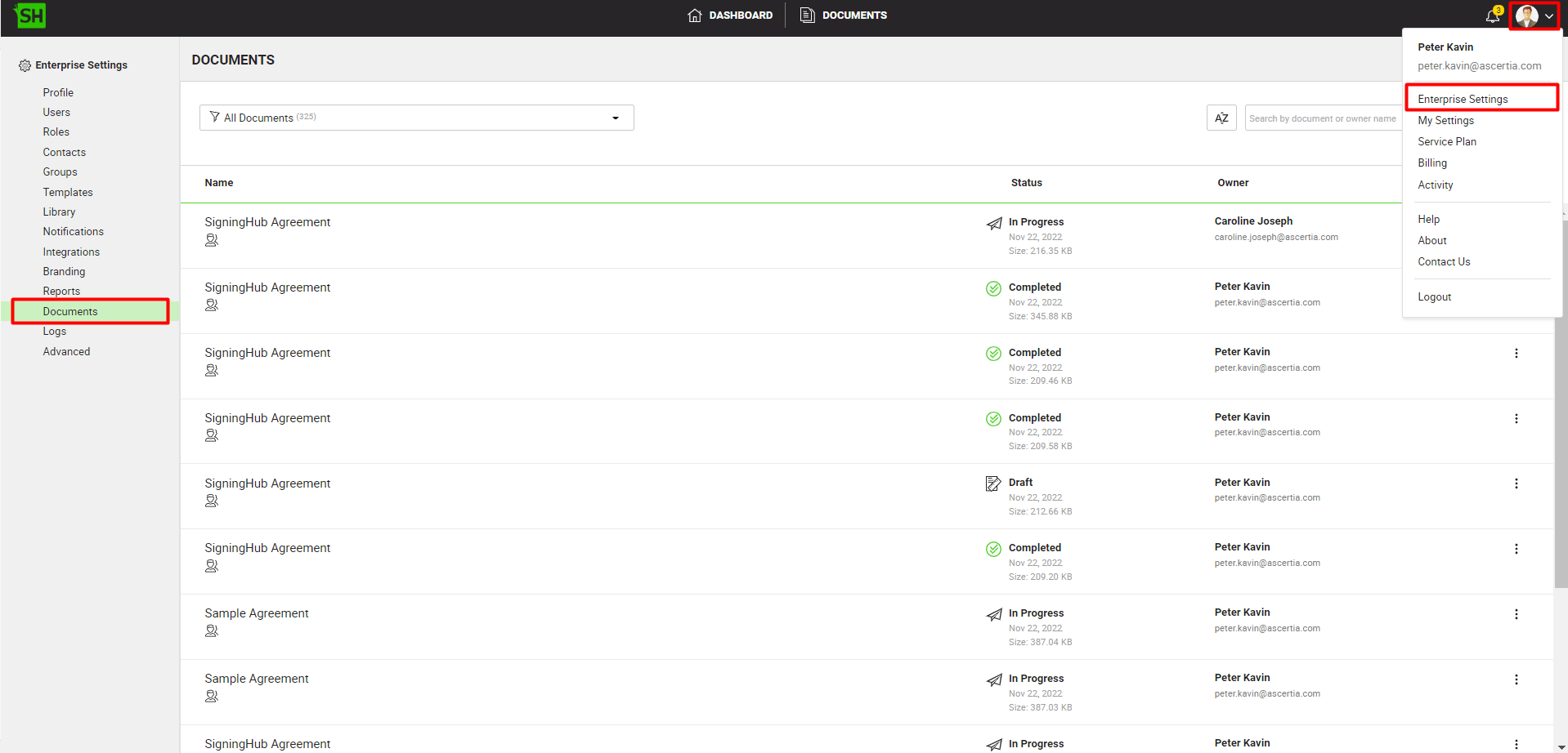 SigningHub allows the Enterprise Admin to access the enterprise documents, if you want to view your enterprise documents, go to the enterprise documents listing as shown in the image below: