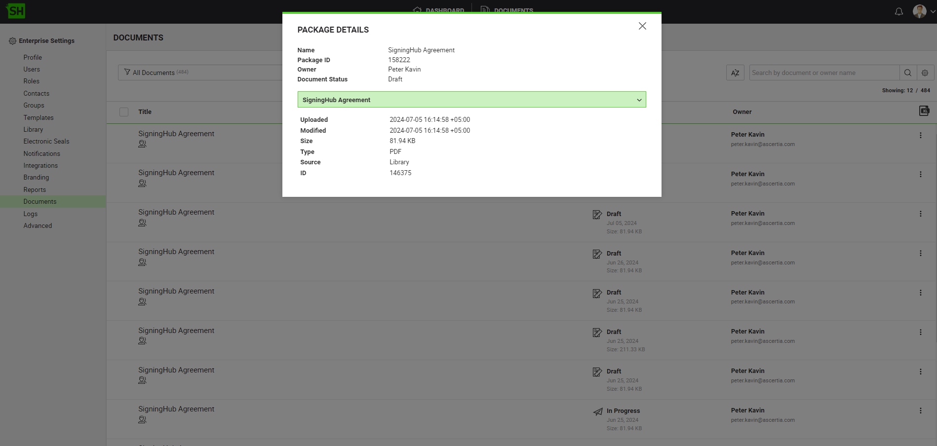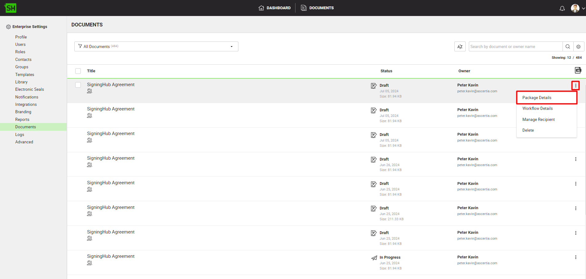 All the document packages within your enterprise will be listed in their respective statuses. - Search/ move to the document package to view its details. Click