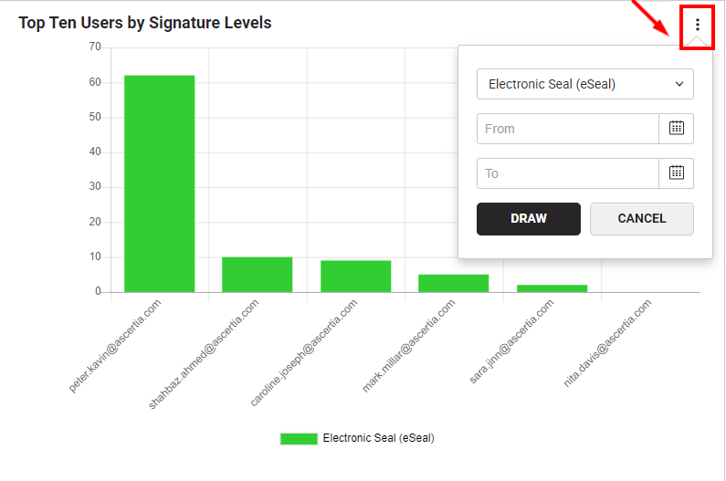 This bar chart lets you select a signature level from the given list and specify the date parameters to see its top ten performers from your enterprise users, i.e. Top ten users who have: