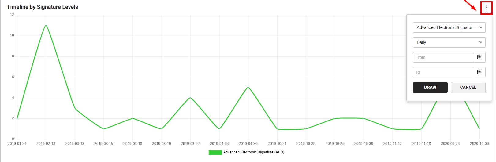 - Total number of Advanced Electronic Signature (AES) applied on daily/weekly/monthly/yearly basis within a specified time period by all your enterprise users