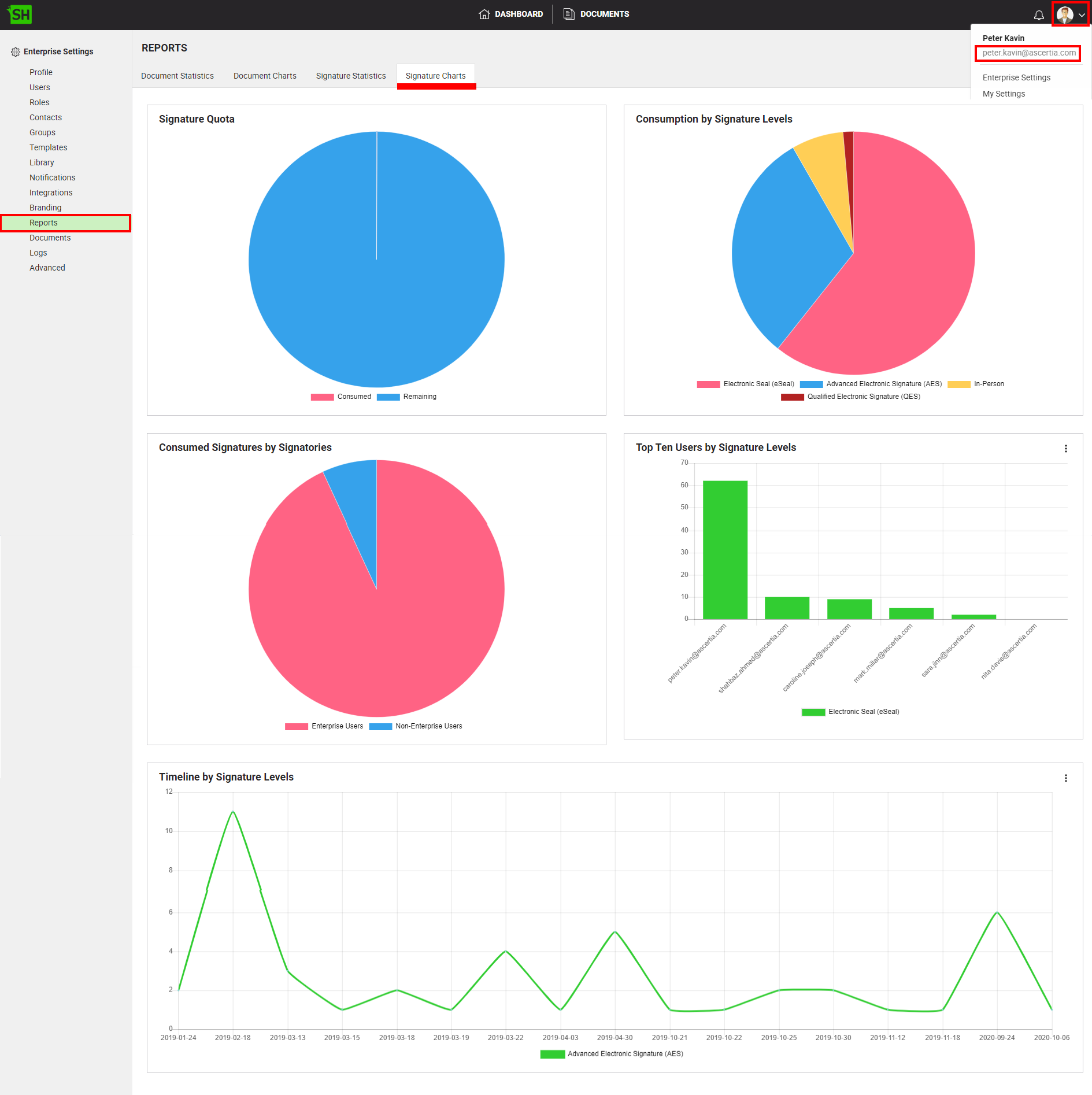 - Total number of Simple Electronic Signatures (SES) applied on daily/weekly/monthly/yearly basis within a specified time period by all your enterprise users