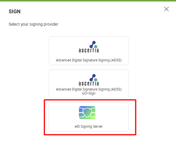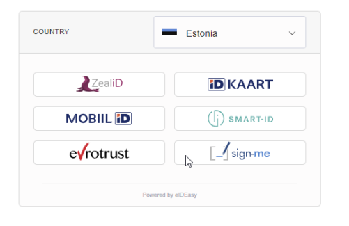 - Upon clicking the "SIGN NOW" button, the eId widget will appear. It will show signing methods based on the country configured in the user's personal settings. Select a signing method to proceed with.