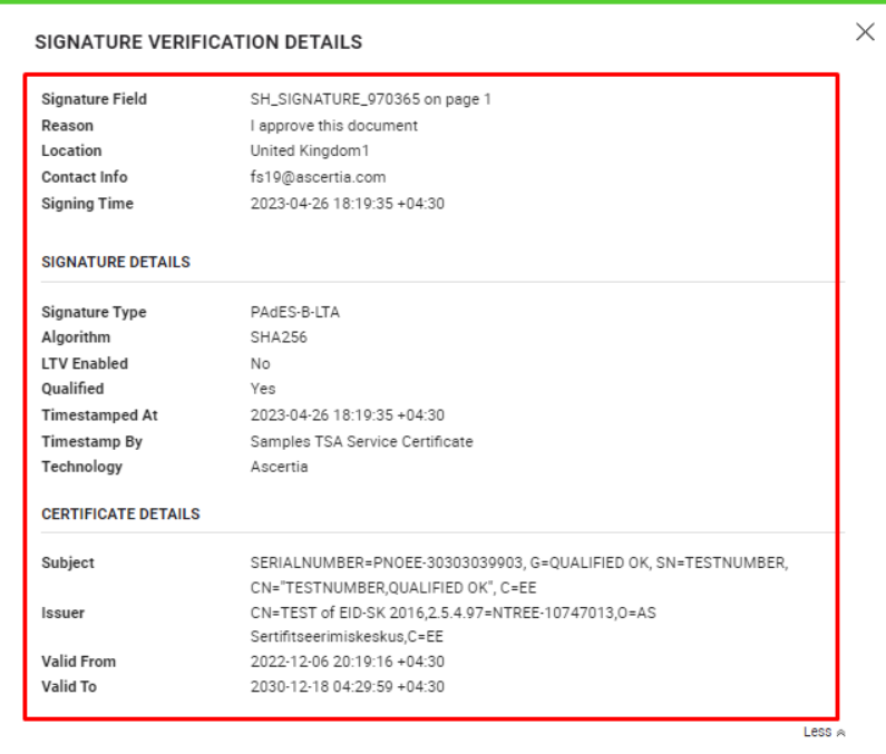 - Open a document having a Qualified Electronic Signature field and sign the document using the eID Easy Signing Server.