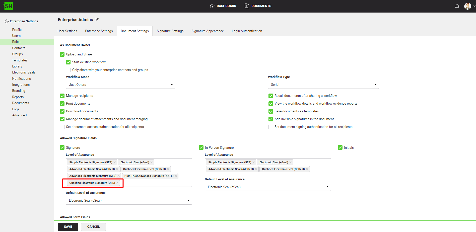 - Against your user role, in the "Document Settings" tab, add the Qualified Electronic Signature (QES) level of assurance.